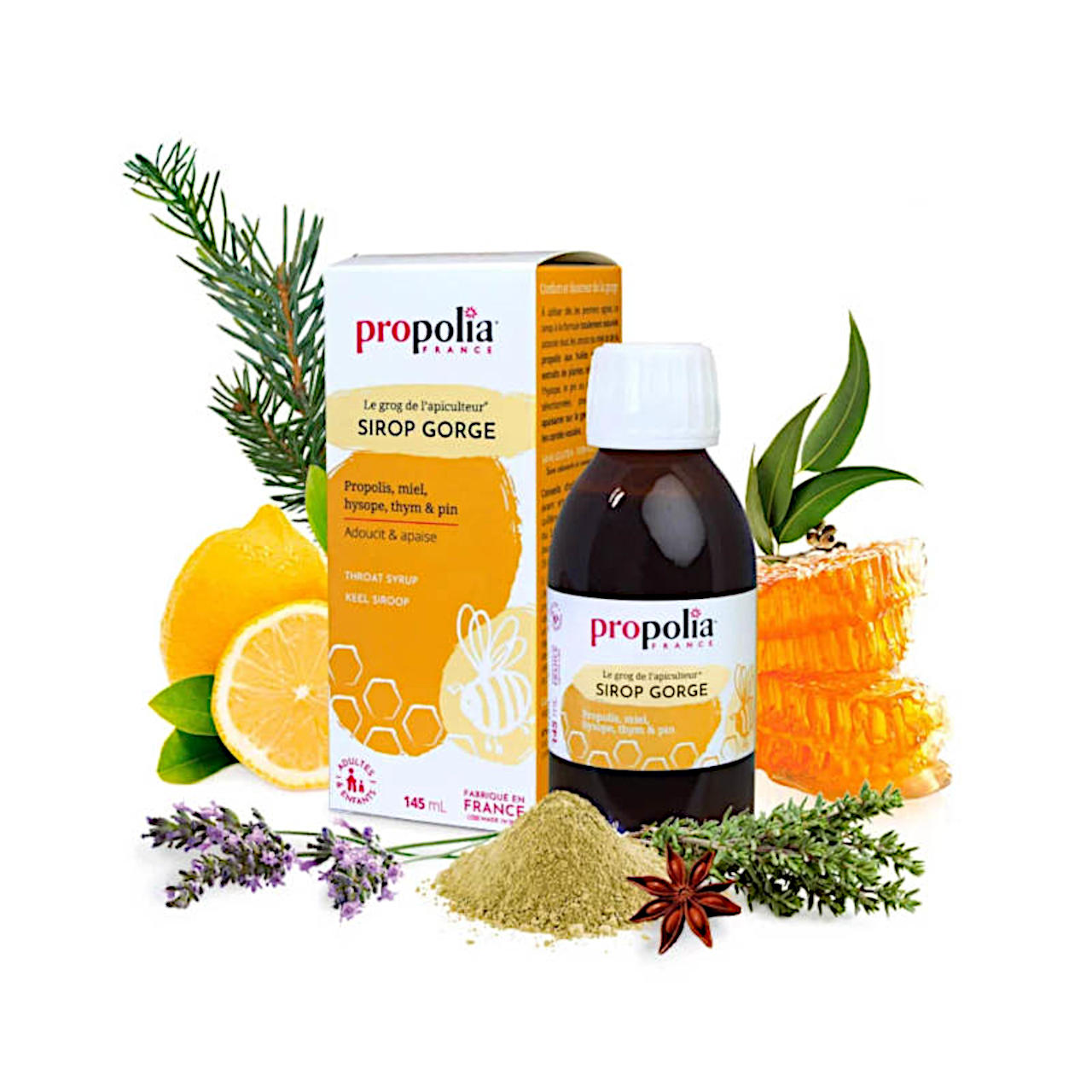 | Inhaltsstoffe: | Weizensirup (glutenfrei), Honig (24%), wässrige Pflanzenauszüge (21%) von Ysop, Pinie, Thymian, Lavendel, Sternanis, Mohn, Königskerze, Malve, Duftveilchen, gereinigter Propolisextrakt (3%), Essenzen von Zitrone, Pinie, Eukalyptus und Thymian. |